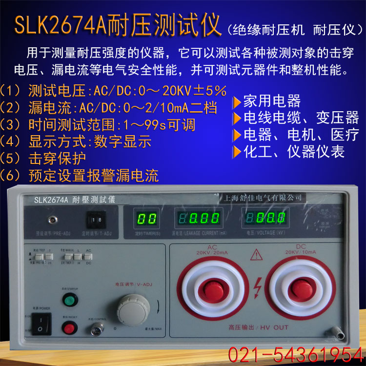 耐压测试仪是测量耐压强度的仪器,它可以直观、准确、快速、可靠地测试各种被测对象的击穿电压、漏电流等电气安全性能指针,并可以作为高压源用来测试元器件和整机性能。SLK2674A耐压测试仪产品系列,是按照IEC、CSA、UL、JIS等国际国内的安全标准要求设计的,耐压输出1kV-50kV,漏电流0-200mA。适合各种家用电器、电源开关、电线电缆、变压器、接线端子、高压胶木电器、电机、医疗、化工、仪器仪表等,以及强电系统的安全耐压和漏电流的测试、同时也是科研实验室、技术监督部门不可缺少的耐压试验设备。
