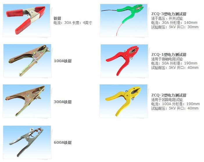 ZCQ系列测试钳主要适用与测量接触电阻,回路电阻等,是高压断路器,变压器等产品的必备测试工具。测试钳主要由钳架,钳口,弹簧,插孔等组成,钳架采用高强度工程塑料压铸,钳口采用铜板冲制成型。钳口齿夹锋利,能够刺穿导体氧化层,圆弧形钳口专用于高压断路器梅花触头的电阻测量。可接长线连接仪器,便于测量。
