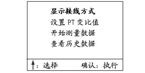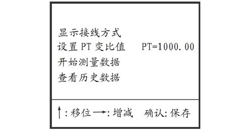 按实际变比值正确输入变比,输入方法:按“→”键移动光标至所需修改处,再按“↑”键增减,改变数值大小。按“确认”键至屏幕提示变比值是否正确,当按“↑”即否时,屏幕返回到重新置PT变比值,如果检查一切无误则按“确定”键进入是否测量状态。
