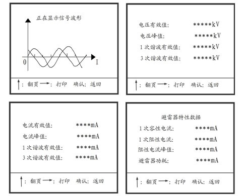 本仪器采用微电脑采样、控制技术,可测量氧化锌避雷器工频电压下的全电流、三次谐波、阻性电流、阻性电流峰值、容性电流、有功功率等;并显示电压、电流的波形;打印测试结果。