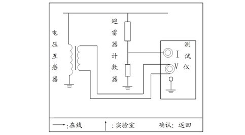 在线测量时电压信号输入端接到与被测避雷器位于同相PT的二次测,电流信号输入端接到避雷器的计数器上端,仪器的接地端接至计数器的下端并与地相联。