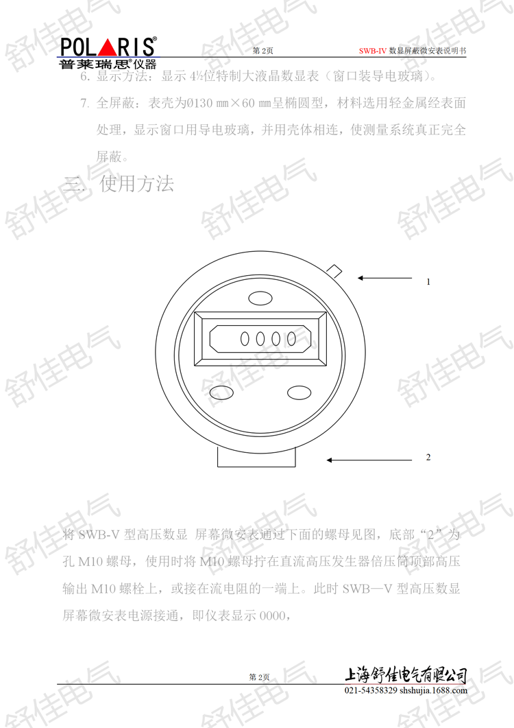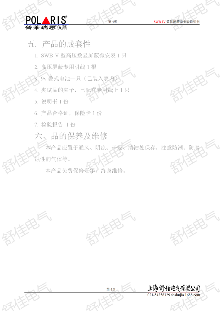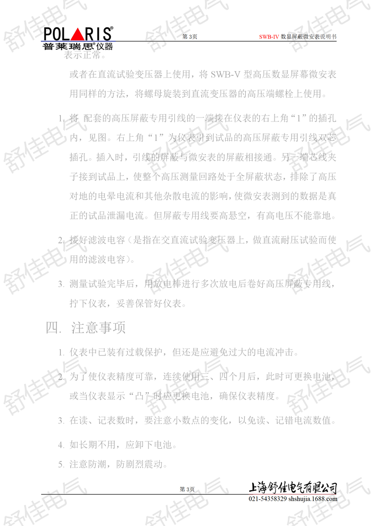 一.概述 SWB-IV数显屏蔽微安表是测量高压电器或绝缘材料等被试品的直流耐压和泄漏电流的直流电流表。主要为直流高压发生器和高压试验变压器的直流试验配套使用的仪表,是对直流高压泄漏电流测试的仪表工具。 直流耐压中泄漏电流测量,是预防性试验规程中的一项重要的试验项目,而传统的指针式微安表在测量直流泄漏电流时,具有读数误差大,抗干扰能力差,抗冲击电流不能保护等缺点。SWB-IV型高压数显屏蔽微安表都克服了上述的缺点。具有使用可靠,不怕放电冲击,数字显示清晰,指示稳定,过载能力强,可自动转换量程(换档)。为了防止测试现场的杂散电流窜入表内,该仪表壳材料选用 轻质金属壳体,保证仪表的屏蔽。 二.主要技术参数指标 1.测量范围:0~199.9uA~1999.9 uA自动换档或0~1999.9uA~19999 uA自动换档 2.分辩率:0.1 uA或0.01uA 3.精度:0.2%±1个字 4.工作电源:9v(层叠电池) 5.工作环境:环境温度:0~40℃ 环境湿度:‹85% 6.显示方法:显示4½位特制大液晶数显表(窗口装导电玻璃)。 7.全屏蔽:表壳为Ø130㎜×60㎜呈椭圆型,材料选用轻金属经表面处理,显示窗口用导电玻璃,并用壳体相连,使测量系统真正完全屏蔽。